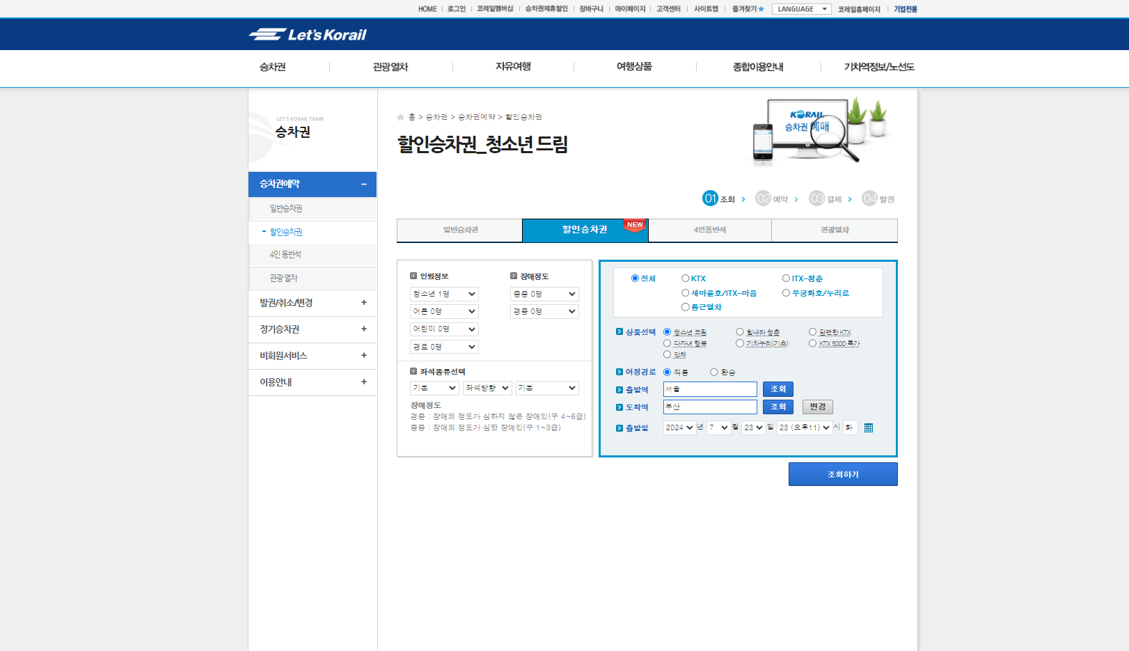 2.출발역, 도착역, 날짜, 시간을 선택합니다.